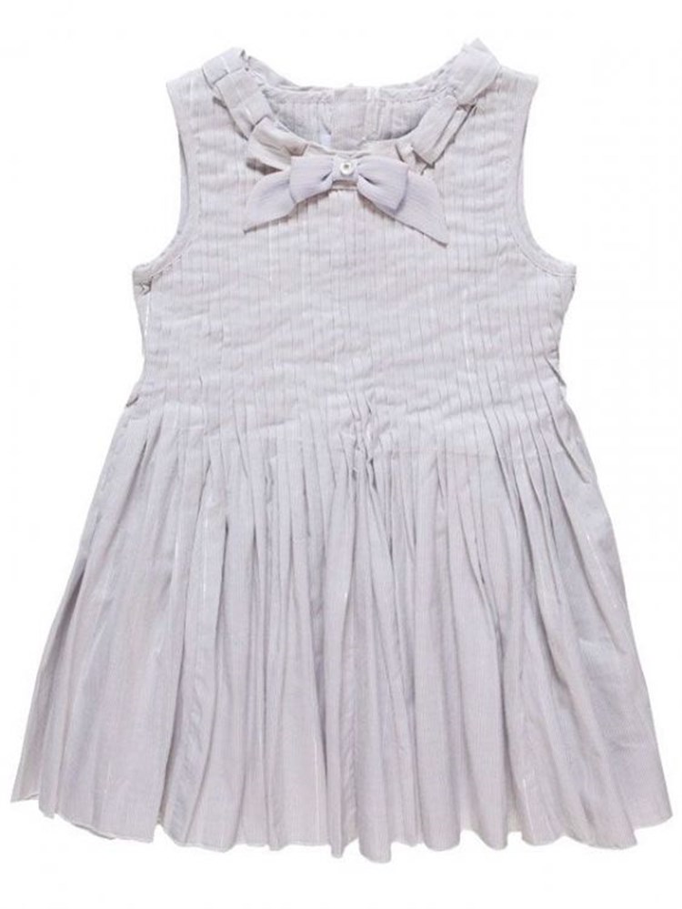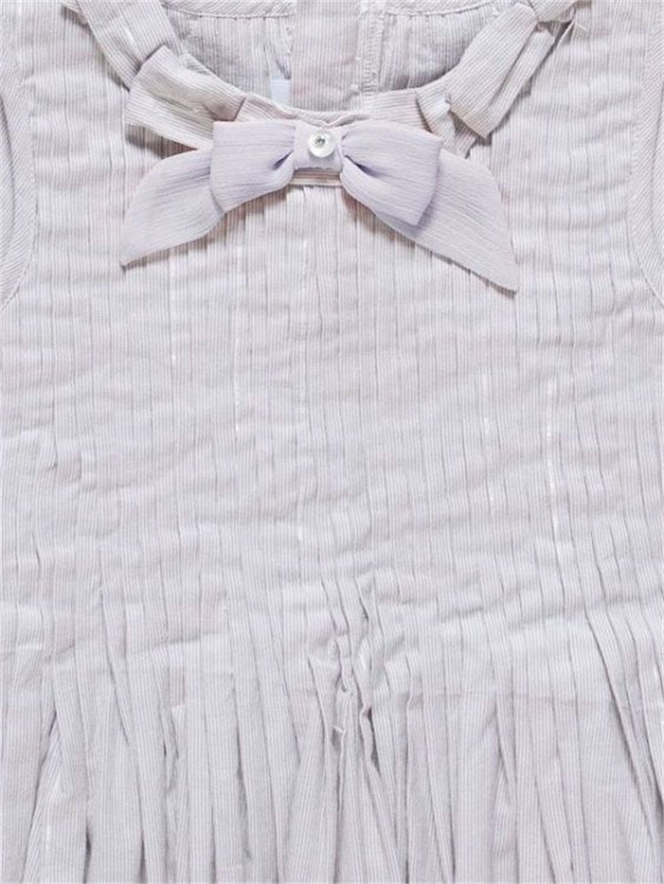 * Yaka kenarı büzgülü ve ön kısmında fiyonk üzerine taşlı düğme detayı bulunan, pileli, sırttan fermuarlı elbise