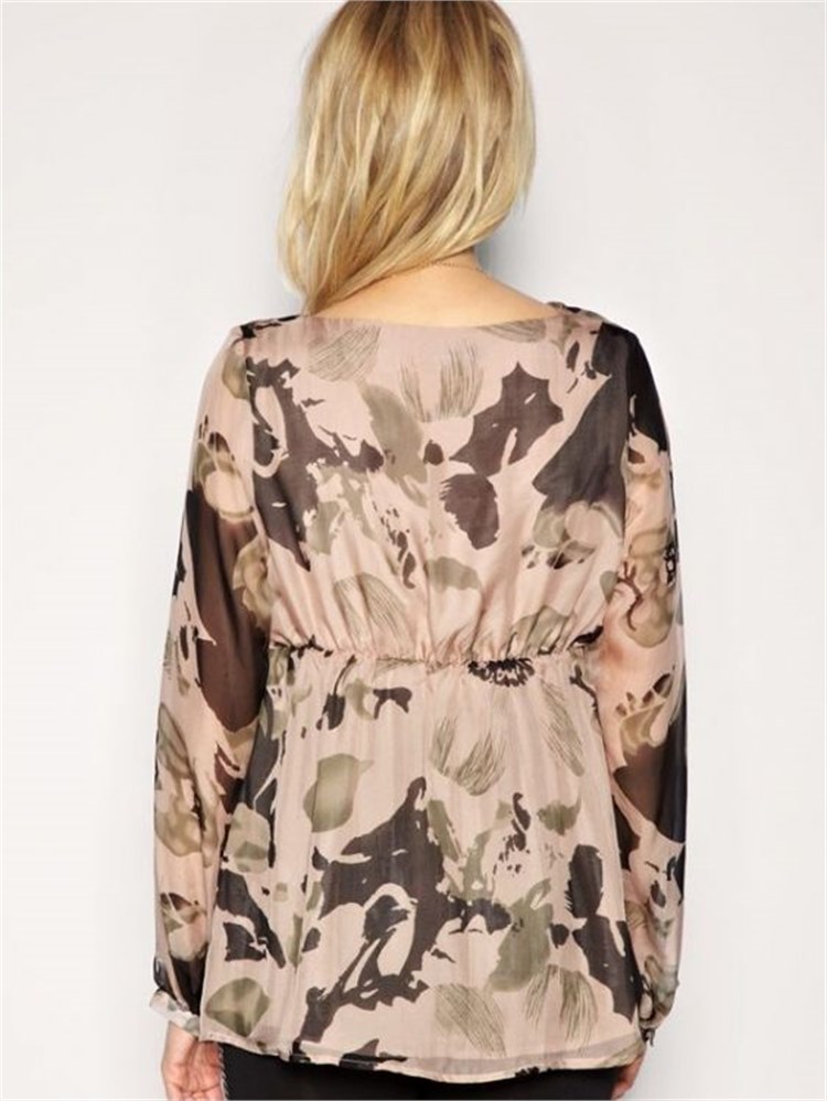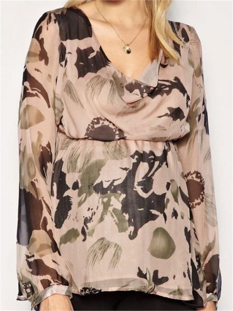 * Göğüs altından büzülü, yakası drape, kahverengi tonlarda desenli şifon bluz