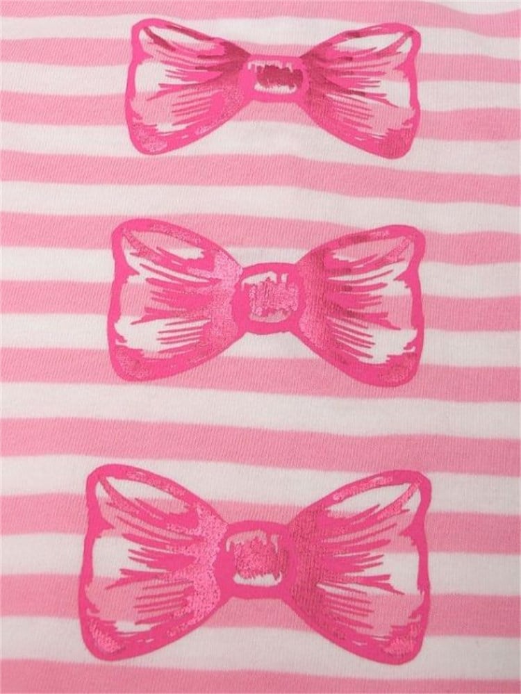 * Çizgili, ön kısmında parlak fiyonk baskıları bulunan, sırtı çıtçıtlı, kısa kol t-shirt